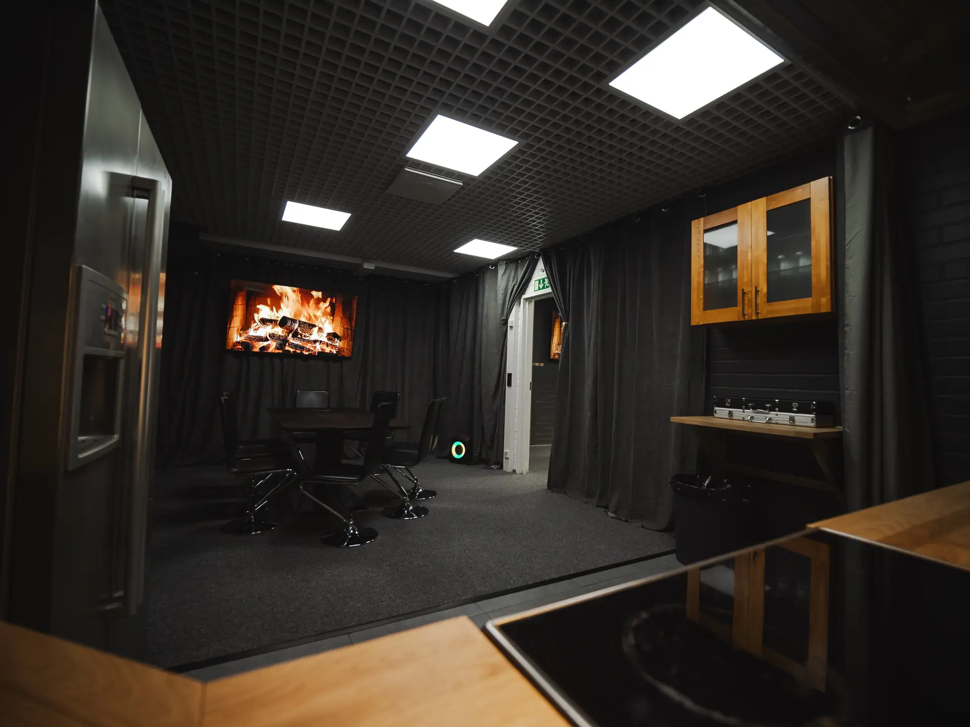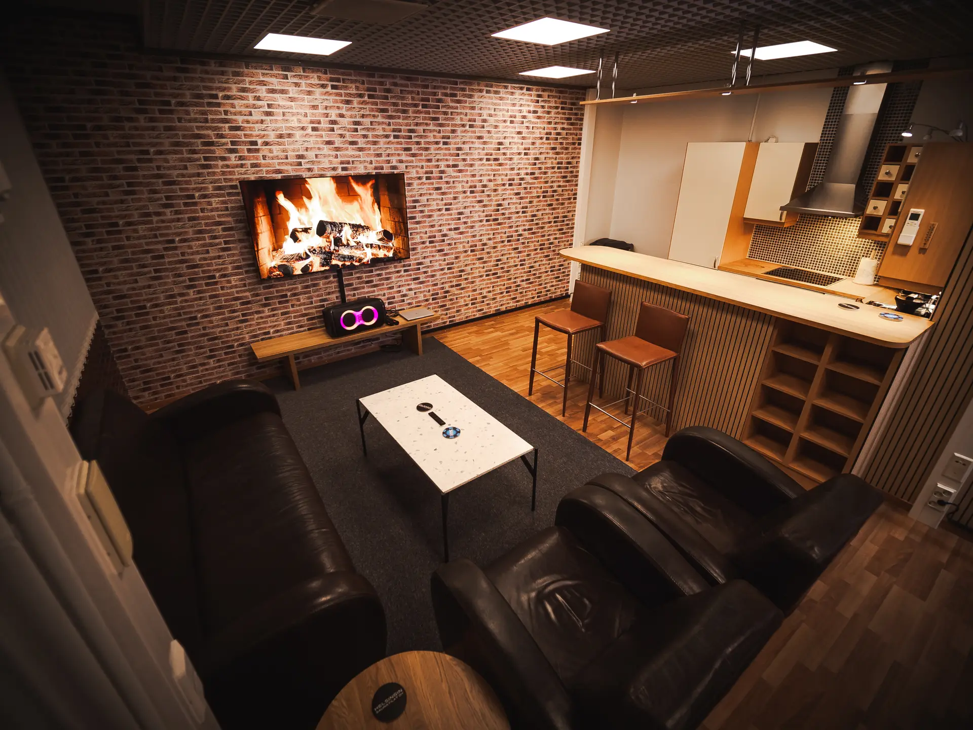 • 6 kpl JBL kaiuttimia ympäri tilaa, jotka saadaan soimaan kaikki yhteydessä toisiinsa – koko tilan voi täyttää samalla musiikilla!